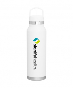 25 oz double wall 18/8 stainless steel thermal bottle with copper vacuum insulation, threaded insulated lid with carrying handle, high polish accent, stainless steel base, and powder coated finish. Hand wash recommended; Do not microwave. Dimensions: 10 H x 3".