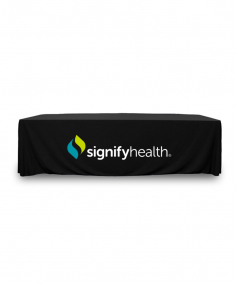 8 ft. Premium PolyKnit throw table cover with one color logo. Fits a 96 inch wide x 30 inch deep table. All corners are rounded meaning they will not gather and lay on the floor. Floor length on 4 sides. This cloth requires no ironing, is EasyCare machine washable and dryer safe.