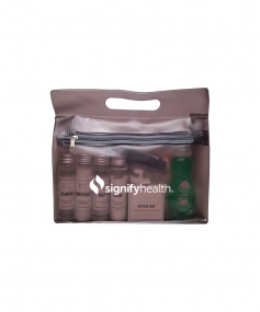 It's always the little things that are forgotten that are hard to find at your new place. We packed all the essentials into one handy tote. EST Shampoo, Conditioner, Body Wash, Lotion & Hand Soap, Old Spice and Dove Deodorants, Toothbrush, Colgate Toothpaste, Whispermint Mouthwash, Brush/Comb, Band Aids, Advil packet, Emergen-C Drink Packs, Alka Seltzer, Baby Wipes, Cotton Balls/Qtips, Tide Laundry Packet and Palmolive Dishwashing Soap. 9 1/2" W x 8" H x 2 3/4" D