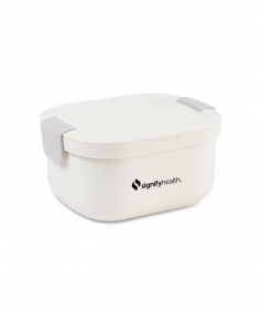 BPA free and made from food-grade materials. Includes fork, knife, and a 1.4 oz. dressing/sauce container that packs neatly into box. Two stackable compartments for separating and organizing meals and snacks. Lid has leakproof silicone sealing ring. Freezer safe and dishwasher safe (without lid). Microwave safe up to 3 minutes. Ideal for salads, sandwiches, or snacks on the go. 58 oz. capacity without inner tray. Complies with Prop 65. 3.9" W x 5.9" H x 7.4" L